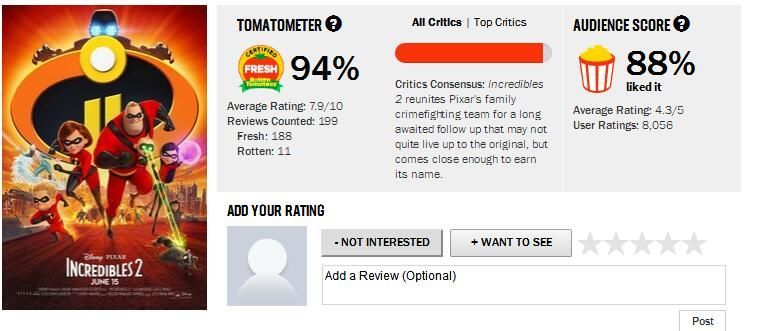 除了超高的票房外,《超人總動員2》的爛番茄新鮮度更是高達94%。
