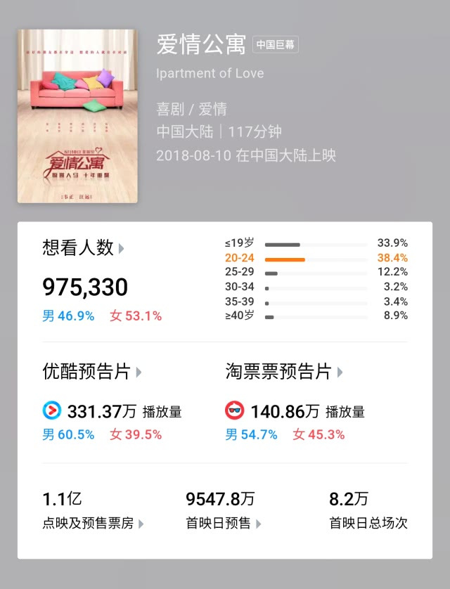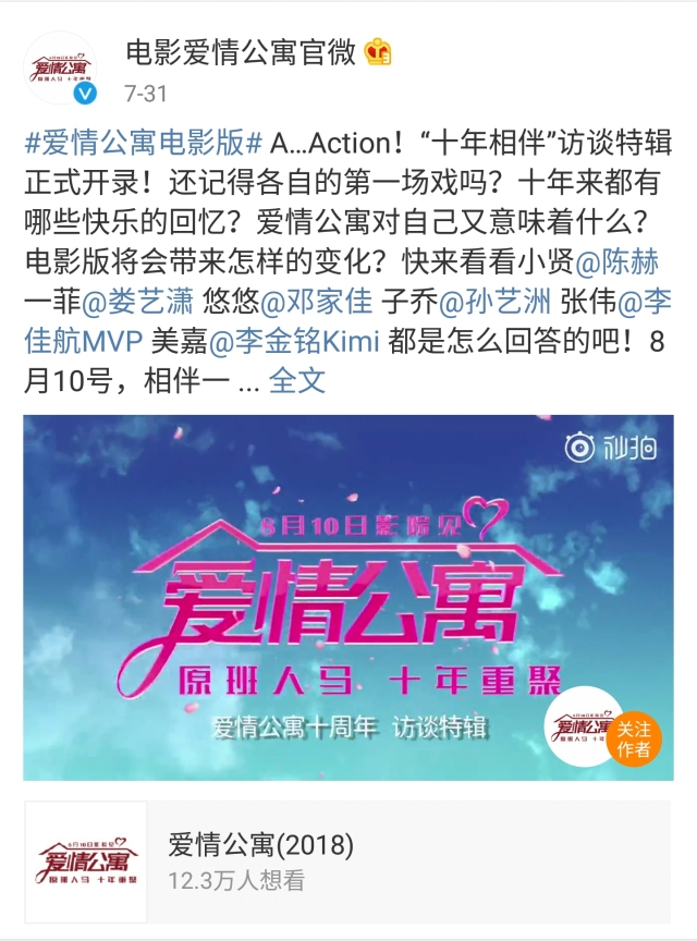 《愛情公寓》一直以來都帶有很強(qiáng)的爭議性,劇版雖然一到四季都撕不掉“抄襲”的標(biāo)簽,但在宣傳力度上卻毫不落于人后,從電影定檔到現(xiàn)在,熱度只高不低?,F(xiàn)今《愛情公寓》電影的預(yù)售票房即將過億,和之前的《我不是藥神》相比,似乎都有了可以一較高低的勢頭,而從電影的網(wǎng)絡(luò)宣傳上也可以看出,這是一部充斥情懷的大電影。