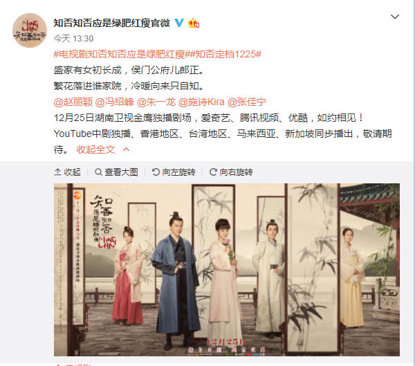 自從《知否》殺青之后,小編就時(shí)不時(shí)上官微瞄一眼,看有沒有劇照或者片花,看看有沒有宣布定檔,終于,今天,12月20日《知否》終于定檔啦!官微發(fā)布,電視劇《知否知否應(yīng)是綠肥紅瘦》定檔圣誕節(jié)12月25日,這真的是最好的圣誕禮物呀。