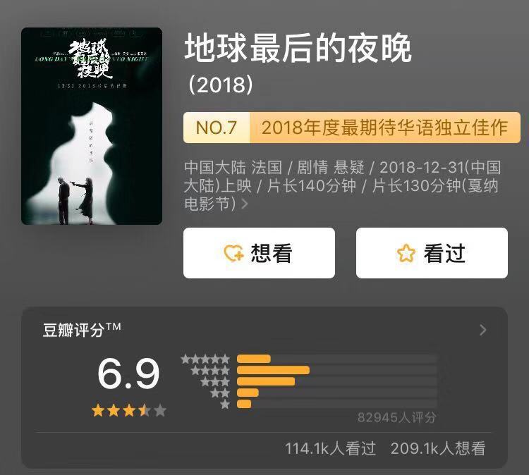 ?2019年元旦檔,電影熒屏上備受關(guān)注的自然是畢贛導(dǎo)演的這部《地球最后的夜晚》了。