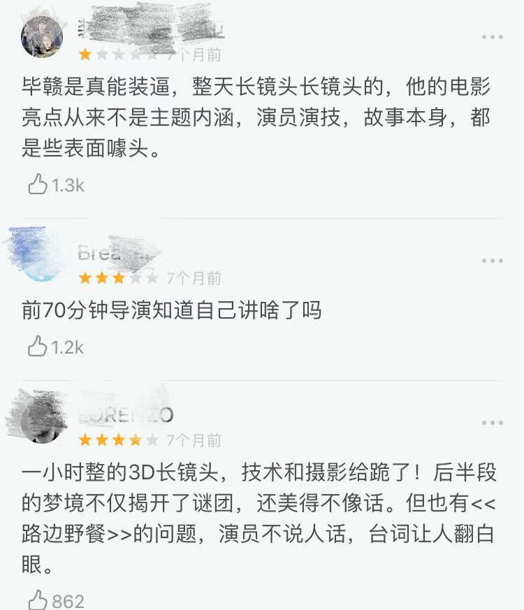 《地球最后的夜晚》豆瓣評(píng)分高達(dá)6.9分,評(píng)價(jià)中不乏對(duì)電影本身的“文藝范”、“長(zhǎng)鏡頭”的認(rèn)可,但普通觀影觀眾的評(píng)價(jià)卻顯得特別的中肯。“畢贛的電影亮點(diǎn)從不在電影的主題內(nèi)涵、演員演技、故事本身,都是些表面的噱頭!”