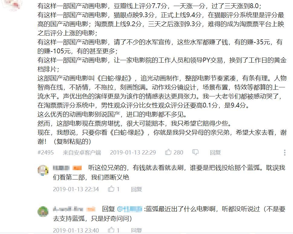 然而,即便如此,《白蛇:緣起》的好評(píng)與影迷自發(fā)宣傳也改變不了票房的頹勢(shì),1月11日上線,18日《白蛇:緣起》票房破億,這對(duì)于制作成本已是8000萬的《白蛇:緣起》來說遠(yuǎn)遠(yuǎn)不夠。有網(wǎng)友統(tǒng)計(jì),這部電影想要回本,票房必須達(dá)到3億才行,而如今電影快要在影片下線了。